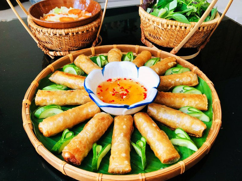 Hausgemachte vietnamesische Frühlingsrollen, gefüllt mit gemischtem Hackfleisch, Glasnudeln und Gemüse, dazu Limetten-Chili-Fischsoße